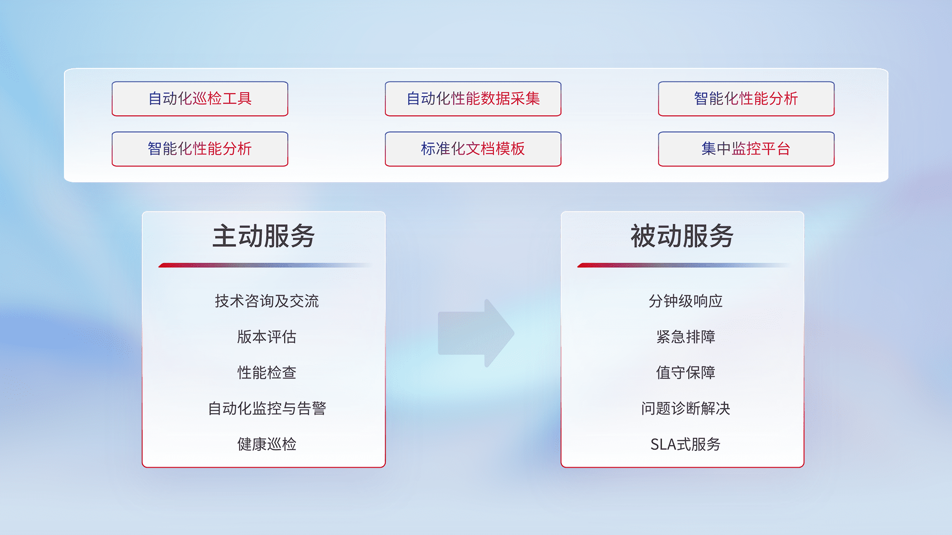 智能化工具和标准化文档,,,,保障服务质量,,,,提供主动服务(包含技术咨询、、、、版本评估、、、、性能检查、、、、自动化监控与告警、、、、健康巡检)和被动服务包含(分钟级响应、、、紧急排障、、、值守保障、、、问题诊断解决、、、、SLA服务)。。